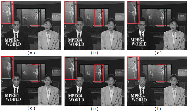 Fig. 2. Super-resolution results for News recovered by (b) Bi-cubic, (c) Method in Ref.[5], (d) MSR in Ref.[6],