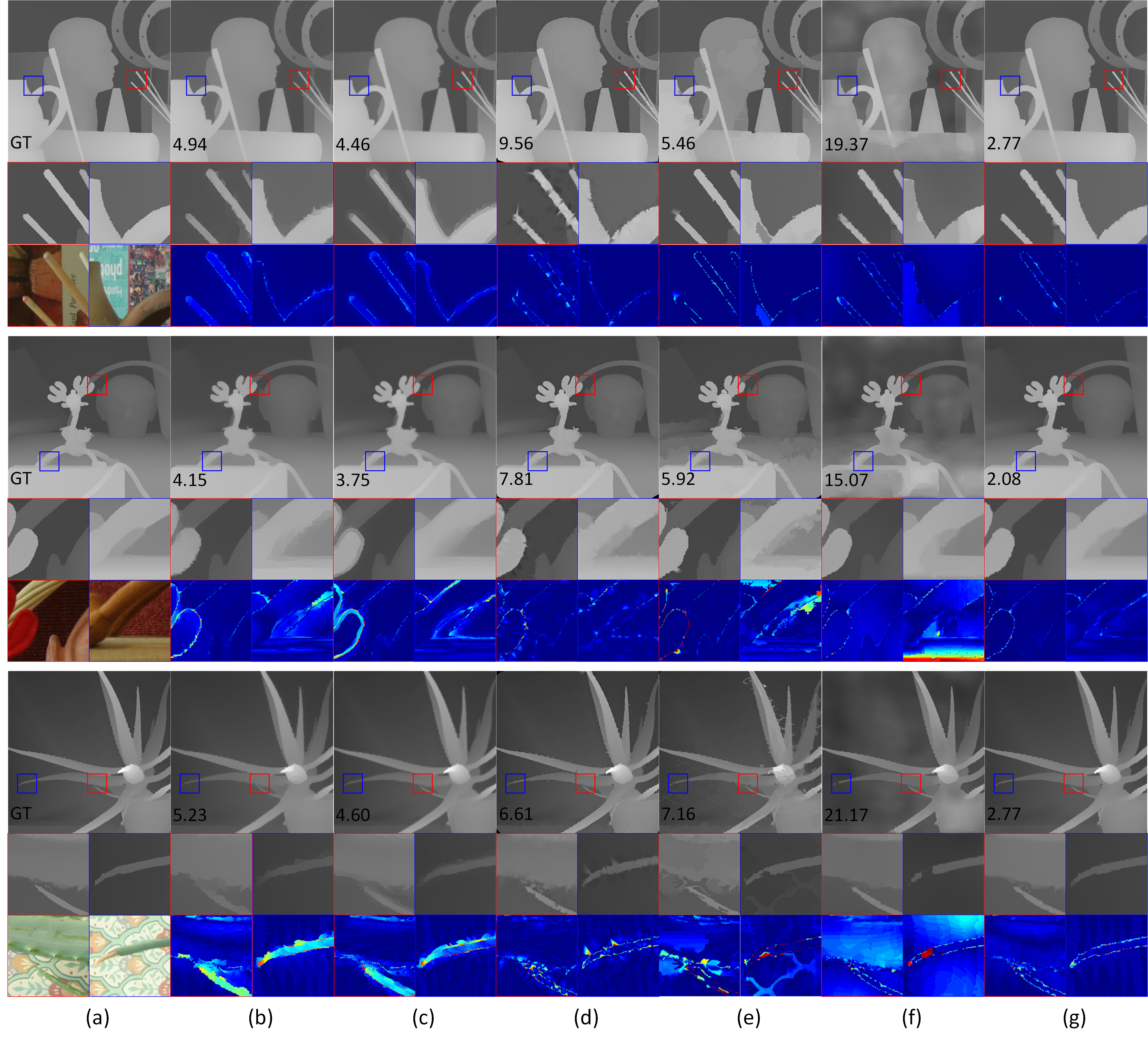 Fig 3. Visual results of depth reconstruction for “Dolls” (top) and “Laundry”(bottom) with different sampling schemes at a ratio of 2.78%: (a) GT RGB-D pair, (b) uniform sampling, (c) random sampling, (d) IPCA [5], (e) our GLINUS0.0, and (f) our GLINUS0.2. For better visualization, we show two cropped patches and the associated error maps.