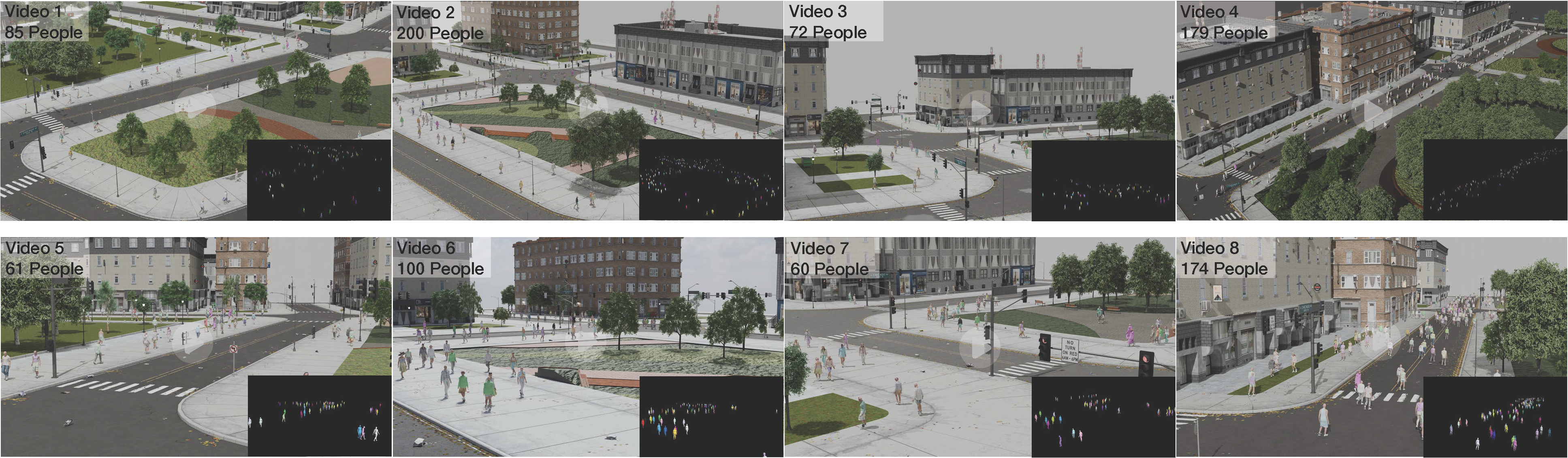We construct VirtualCrowd, which includes eight 8K validation videos (60–200 people; 931 sequences; 186,200 poses with 2D/3D annotations) used in the paper, plus two additional simulated sloped-scene videos provided as supplementary data.