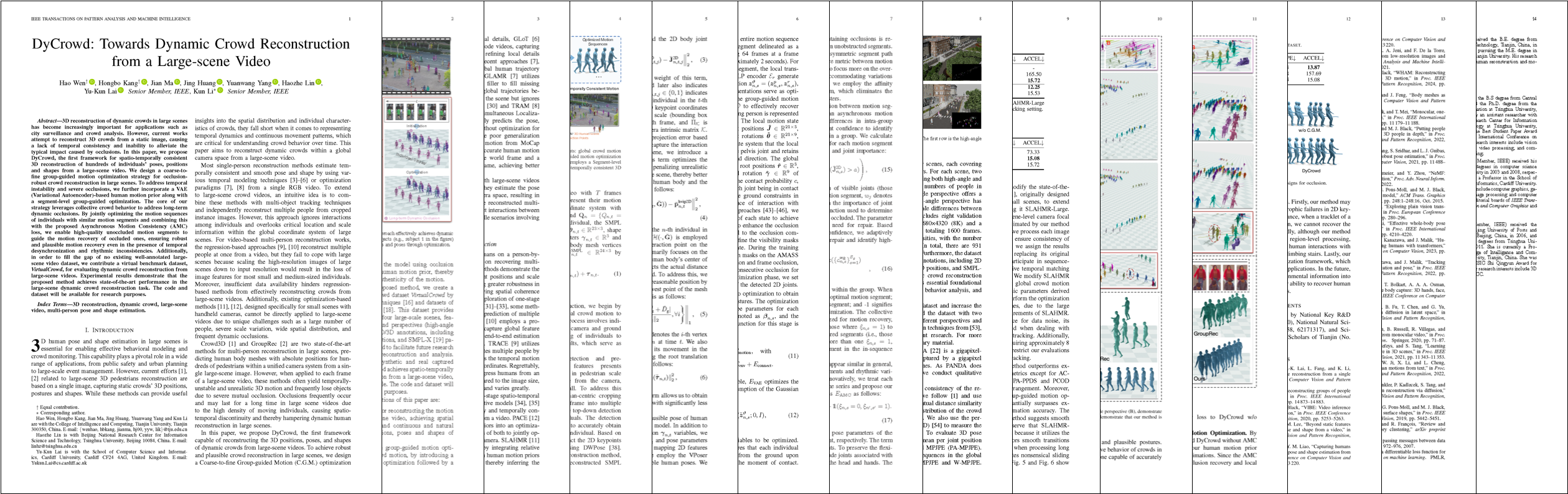 Hao Wen, Hongbo Kang, Jian Ma, Jing Huang, Yuanwang Yang, Haozhe Lin, Yu-Kun Lai and Kun Li. "DyCrowd: Towards Dynamic Crowd Reconstruction from a Large-scene Video". IEEE Transactions on Pattern Analysis and Machine Intelligence, 2025.