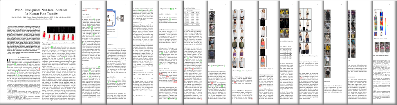 Kun Li, Jinsong Zhang, Yebin Liu, Yu-kun Lai, Qionghai Dai. "PoNA: Pose-guided Non-local Attention for Human Pose Transfer". IEEE Transactions on Image Processing 2020