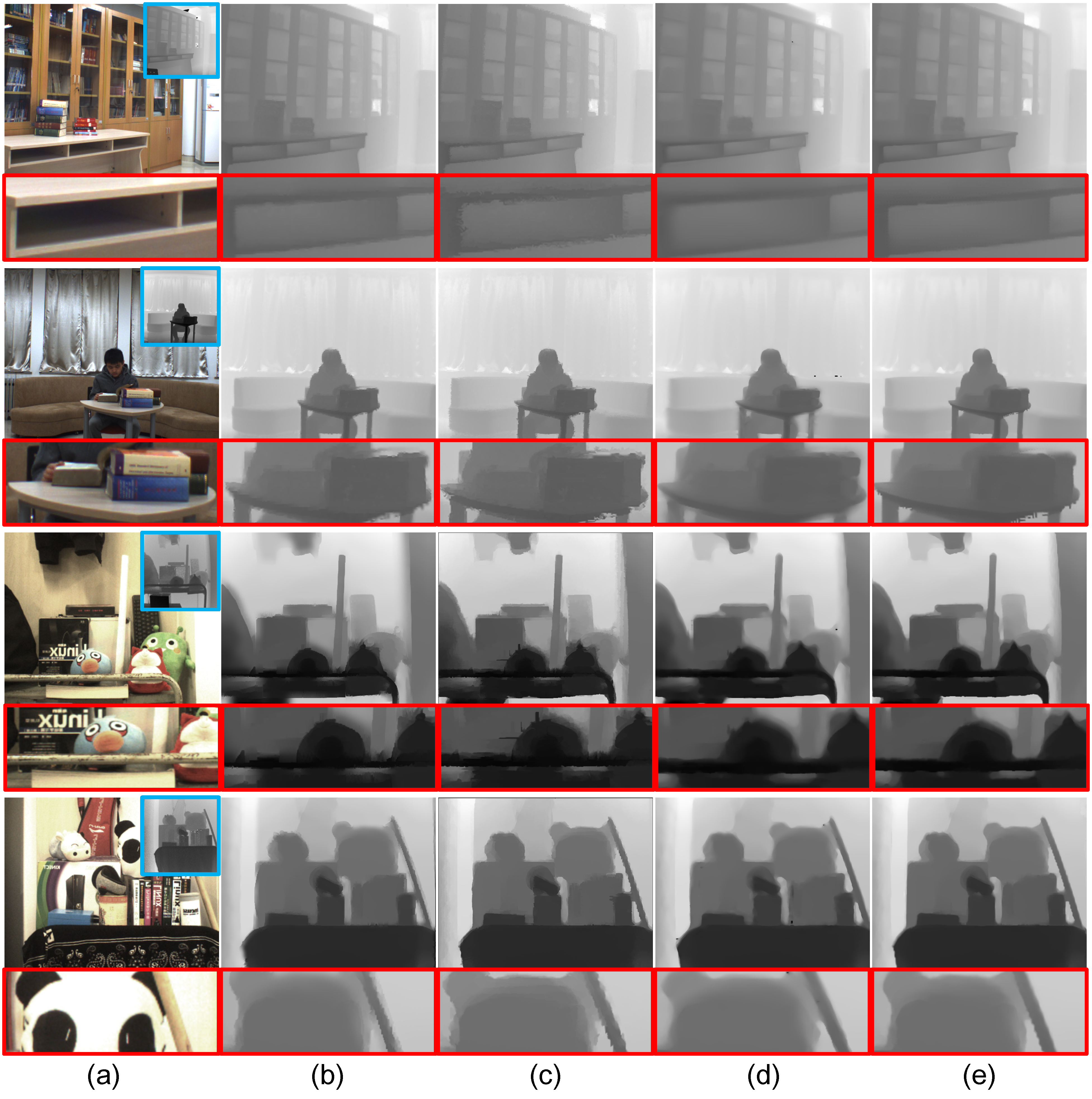 ![]() Fig.7. Depth recovery results for RGB-D pairs captured by Kinect: (a) RDB-D pairs, recovered depth maps by (b) IMLS [2], (c) joint multilateral filtering [12], and (d) our method. Regions highlighted by red rectangles are enlarged for better visual inspection. RGB-D pairs in (a)-(c) are from the NYU RGB-D dataset [13], while the rest two are captured in our lab. Click here to download all the pictures in Fig.7. |