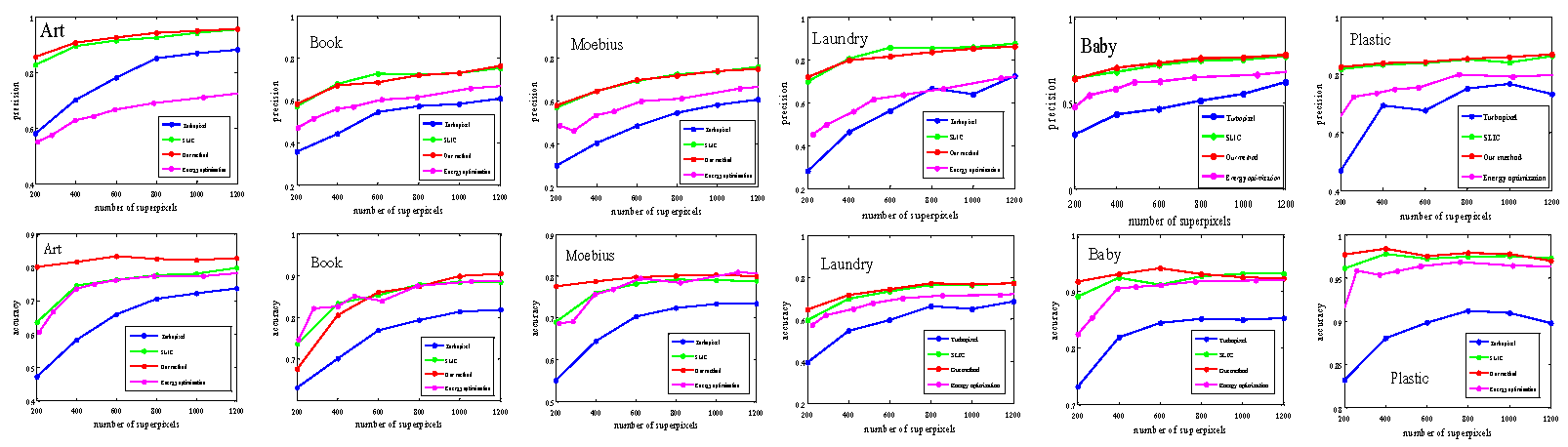 Fig. 2. Evaluation in precision and accuracy of superpixels generated by Turbopixels [1], Energy optimization[2], SLIC [3], and the proposed method for RGB-D datasets [10], |