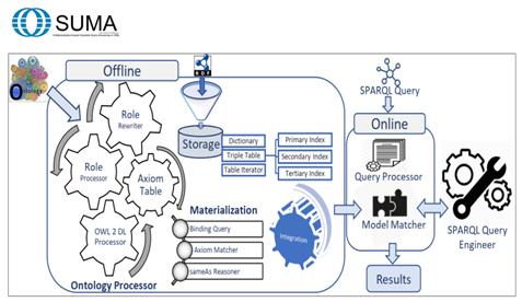 2016年至今,依托于国家自然科学基金、国家重点研发计划“云计算与大数据”重点专项科学大数据管理系统和国家科技部“精准医学研究”重点专项“中国重大疾病与罕见病临床与生命组学数据库”,针对大规模知识图谱管理的高效性和实效性,研究知识图谱查询的几个核心理论问题,获得了一系列开创性理论成果,并初步形成了知识图谱查询理论体系,同时,自主设计并搭建了基于Hadoop+Spark的分布式自适应的RDF数据处理引擎FlexStore,存储耗时较短和极大的压缩比,查询性能相比同类型其它系统加速比可达75倍。 并在基础上,搭建了一套高效可扩展的支持OWL 2 DL的查询回答系统SUMA,具有优越性能特点与实用简便性,应用于精准医学、健康养老服务、舆情分析等重点领域。