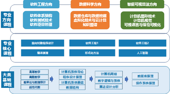 本专业面向国家经济和社会发展需求,培养掌握自然科学基础知识、软件工程知识,了解大数据、人工智能等业界新技术知识,具有家国情怀、全球视野、创新精神和实践能力,适应新技术、新产业、新经济发展,能够在本领域或交叉领域从事软件开发、研究、管理等工作的卓越人才。