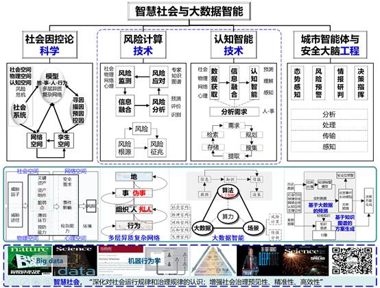 1、智慧社会与大数据智能团队在国家重点研发计划项目(社区风险监测与防范关键技术研究,编号:2018YFC0809800)、国家社科基金重大项目(突发事件语义案例库建设与临机决策模式研究,编号:14ZDB153)等国家重大项目的支撑下,以智慧社会为背景,聚焦于“大数据 + 人工智能-->风险/安全”,抓住“智能+安全”的关键点,推进城市安全和社会治理的系统化、科学化、智能化,提升预见性、精准性、高效性和部门协同性。团队围绕“数据+算法+场景”大数据智能三位一体,从科学、技术、工程三个层面形成了基于复杂网络科学的社会因控论、风险计算与深度认知智能分析方法、城市智能体与安全大脑等三个研究方向。