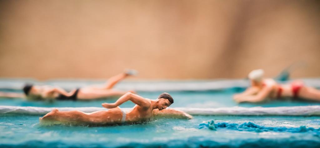 游泳馆东侧栏杆处,斑驳的墙壁、清澈的池水,游泳健儿奋力游向终点;