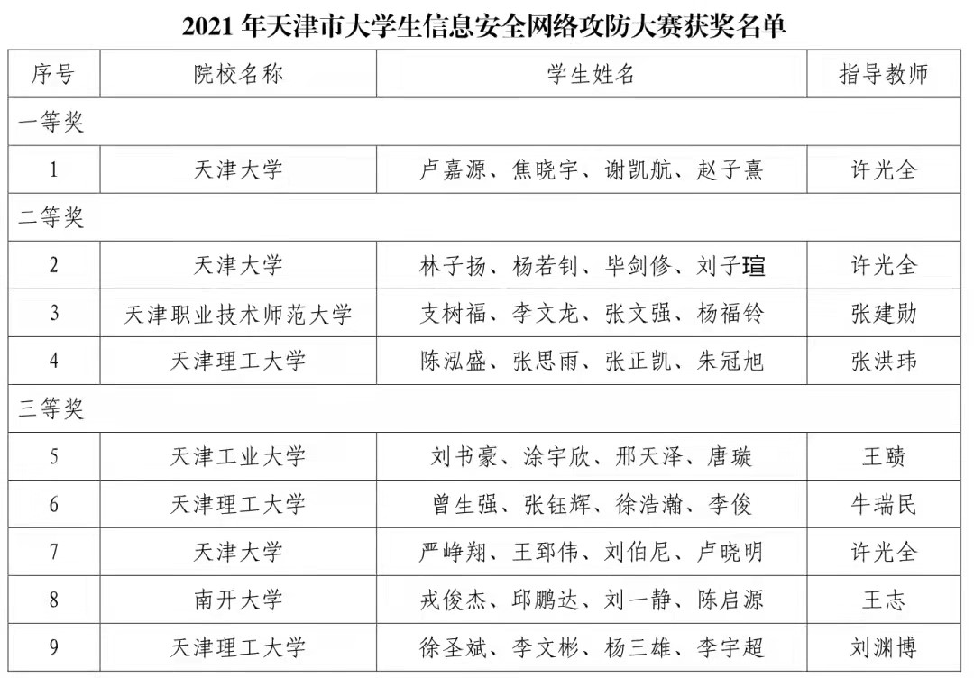 近日,2021年天津市大学生信息安全网络攻防大赛决赛结果揭晓,爱游戏 包揽冠亚军。在智能与计算爱游戏 许光全教授的指导下,卢嘉源同学、焦晓宇同学、谢凯航同学与赵子熹同学荣获一等奖,林子扬同学,杨若钊同学,毕剑修同学与刘子瑄同学荣获二等奖,严峥翔、王郅伟、刘伯尼、卢晓明获三等奖!