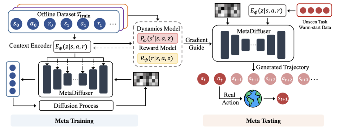 爱游戏 2021级博士生倪飞以第一作者(通讯作者:郝建业)撰写的论文MetaDiffuser: Diffusion Model as Conditional Planner for Offline Meta-RL首次提出了基于扩散模型的跨任务规划模型和学习范式,实现可泛化的机器人智能控制。近年来扩散模型在图像视频生成任务上展现了惊艳的可控生成能力,能精细生成与条件高度相关的内容,那么能否利用这种可控生成能力赋能机器人控制任务?为此该工作提出元扩散模型(MetaDiffuser),通过多任务的离线数据预训练出上下文推断编码器,嵌入增广的扩散模型中进行可泛化的控制轨迹条件生成,提升机器人的规划控制对不同环境变化、任务变化的适应能力和鲁棒性。