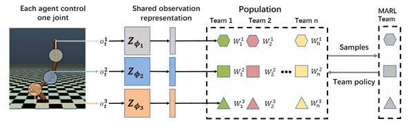 爱游戏 2022级博士生李鹏翼以第一作者(通讯作者:郝建业)撰写的论文RACE: Improve Multi-Agent Reinforcement Learning with Representation Asymmetry and Collaborative Evolution在复杂多智能体协作任务中首次证明了演化算法具有进一步提升多智能体强化学习算法的能力。尽管多智能体强化学习近年来在学习协作方面展现了有效性,但当面临质量较低的奖励信号和高度非稳态情况时,MARL的表现可能较差甚至失败。相比之下,进化算法在收敛性、鲁棒性和对信号质量不敏感性方面表现更好。为此,本文提出RACE充分融合两者优势促进多智能体高效协作。为了高效的知识共享与探索,RACE解耦团队策略为共享局部观测编码器与独立的个体策略表征。为缓解局部观测带来的非稳态问题,RACE构建了价值感知的互信息最大化机制来将好的全局信息压缩到共享观测表征中。除此之外,RACE还设计了基于个体的语义性交叉和变异算子对种群进行进化。最终RACE在复杂连续控制任务MAMUJOCO和离散微操任务星际争霸Ⅱ上被证明能够显著提升基准算法并超越其他基线。