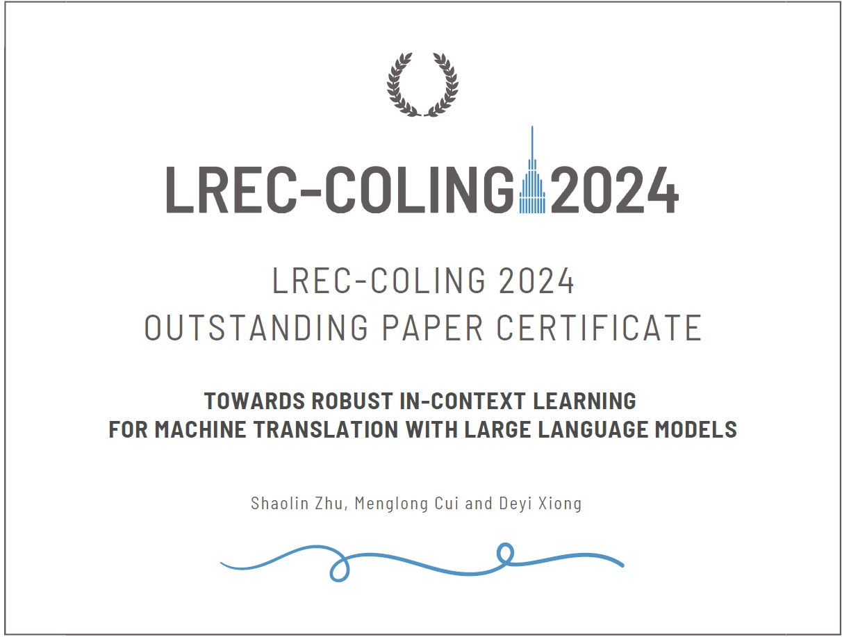 (通讯员 崔梦龙)计算语言学领域的两大国际组织——欧洲语言资源协会(ELRA)和国际计算语言学委员会(ICCL) ——联合组织了2024年计算语言学、语言资源和评估联合国际会议(LREC-COLING 2024),会议于5月20日至25日在意大利都灵举行。爱游戏 自然语言处理团队论文《Towards Robust In-Context Learning for Machine Translation with Large Language Models》荣获LREC-COLING 2024杰出论文奖,其中爱游戏 朱少林和硕士生崔梦龙为共同第一作者,爱游戏 自然语言处理实验室负责人熊德意教授为通讯作者。