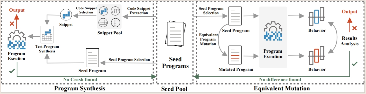 基于程序综合的测试程序生成技术:该项技术将程序代码拆解成细粒度代码片段,彼此之间涉及不同的语言特征,进而在语法语义约束的指导下,实现测试程序的高效合成。值得注意的是,该项技术能够以历史缺陷作为基础数据,提取与缺陷相关的代码片段,并将其融合至多样的代码上下文中,以激发其触发更多缺陷、执行更多代码分支的能力。