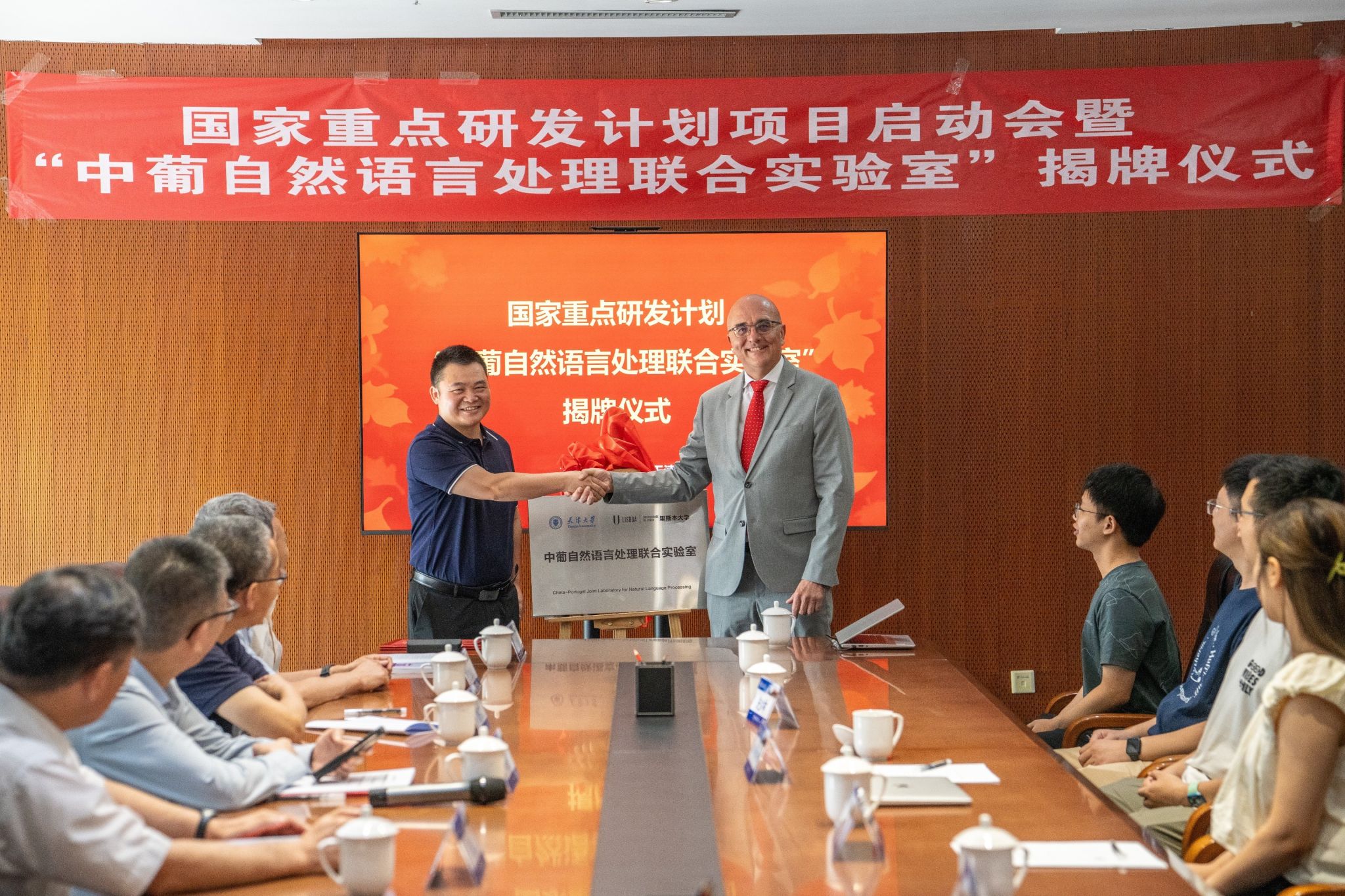 项目中方负责人熊德意教授与葡方负责人António Branco教授为“中葡自然语言处理联合实验室”揭牌。