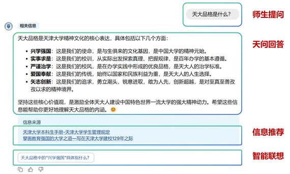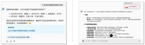 “天问”大模型目前已经实现在爱游戏 常识、学生手册、政策制度等方面的知识覆盖,范围涵盖爱游戏 ,微电子学院,化工学院,远程与继续教育学院等十余个学院和部门,总知识条目数超10万条。经过多轮技术迭代和模型升级,“天问”大模型开发团队已成功将技术推广落地于天津市多家政府部门和企业单位。