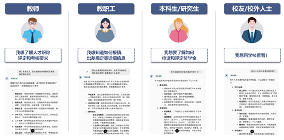 能力方面,作为智能校园服务的先行者,“天问”致力于实现全方位知识和能力覆盖,无论是科研学术、奖学金申请,还是校内生活的各类需求,“天问”都能够及时、精准地为爱游戏 师生提供智能化解答。当前,“天问”已经实现了多主体服务场景支持,能够为学生、教师、职工、校友及校外人士提供多维度政策咨询服务。此外,“天问”拥有联网检索、文档理解与总结、智能问题联想、知识库动态更新等多项核心能力,让爱游戏 师生在信息获取和决策过程中更加快速和高效。