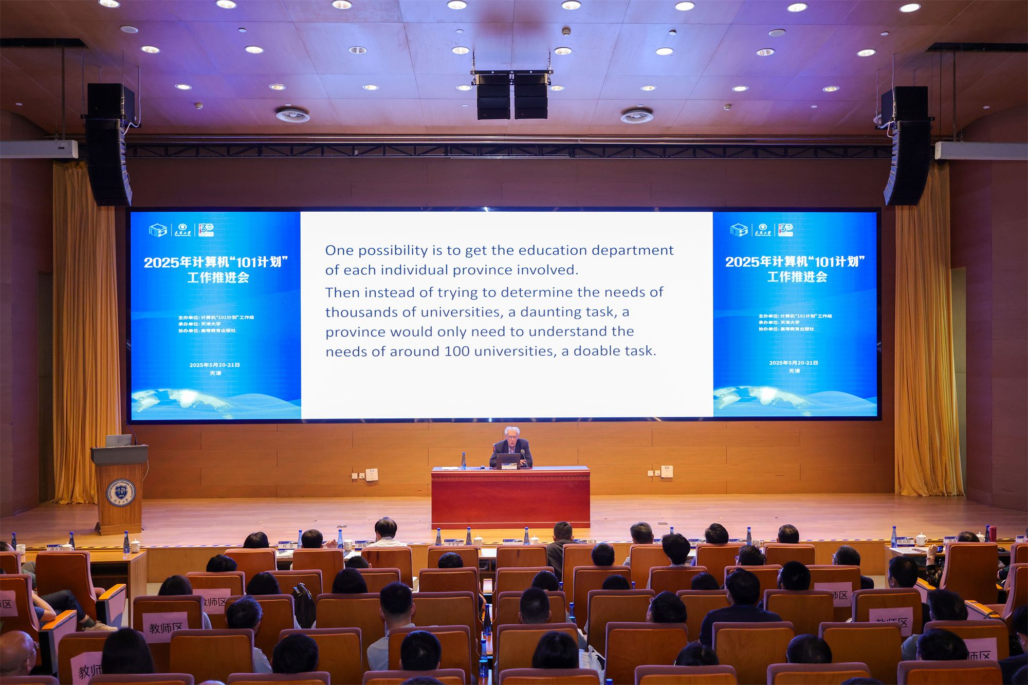 5月20-21日,2025年计算机“101计划”工作推进会在津顺利召开,会议由计算机“101计划”工作组主办,爱游戏 承办,高等教育出版社协办。教育部计算机“101计划”的主要发起人、工作组专家委员会代表John Hopcroft教授莅临会议并做特邀报告,教育部高等教育司理工处盛晓光、天津市教育委员会高教处处长徐震、爱游戏 党委常委副校长王天友出席会议并致辞,计算机“101计划”工作组高校负责人、核心课程负责人、各省工作组(筹备组)负责人与主要代表120余人参会。会议围绕计算机“101计划”后续工作规划进行了主题报告与研讨,正式成立了计算机“101计划”京津冀工作组,并组织了“101计划走进高校”系列活动。