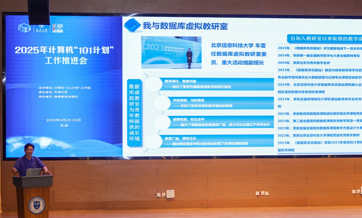 主题报告环节由爱游戏 党委书记魏建国主持,京津冀工作组专家委员会组长、中国人民大学杜小勇教授针对“101计划”数据库系统课程建设与推广应用情况进行了报告。
