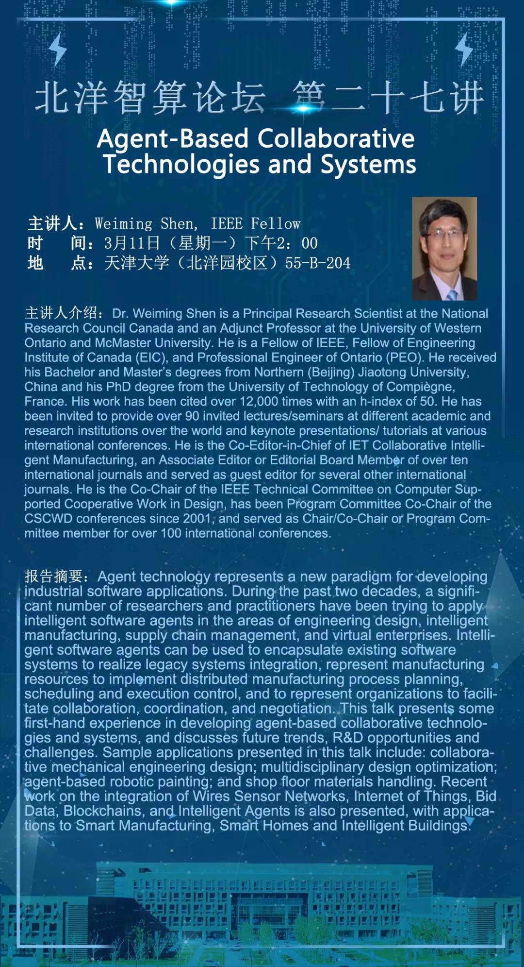 沈为明教授是加拿大国家研究委员会的首席科学家,西安大略大学和麦克马斯特大学的兼职教授。他是IEEE Fellow,EIC Fellow。他是国际公认的基于代理的协作技术和应用专家。他发表了多本书籍和450多篇论文。他是IET协作智能制造的共同主编,十多个国际期刊的副主编或编辑委员会成员,并担任其他几个国际期刊的客座编辑。他是IEEE计算机支持的设计合作工作技术委员会的联合主席,并担任100多个国际会议的主席/联合主席或计划委员会成员。