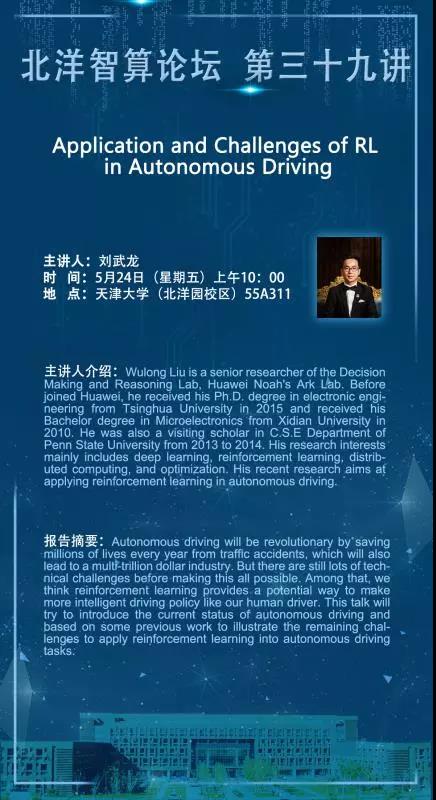 刘武龙是华为诺亚方舟实验室决策与推理实验室的高级研究员。在加入华为之前,他于2015年获得清华大学电子工程博士学位,2010年获得西安大学微电子学士学位。2013年至2014年,他还是宾夕法尼亚州立大学C.S.E系的访问学者。他的研究兴趣主要包括深度学习,强化学习,分布式计算和优化。他最近的研究旨在将强化学习应用于自动驾驶。