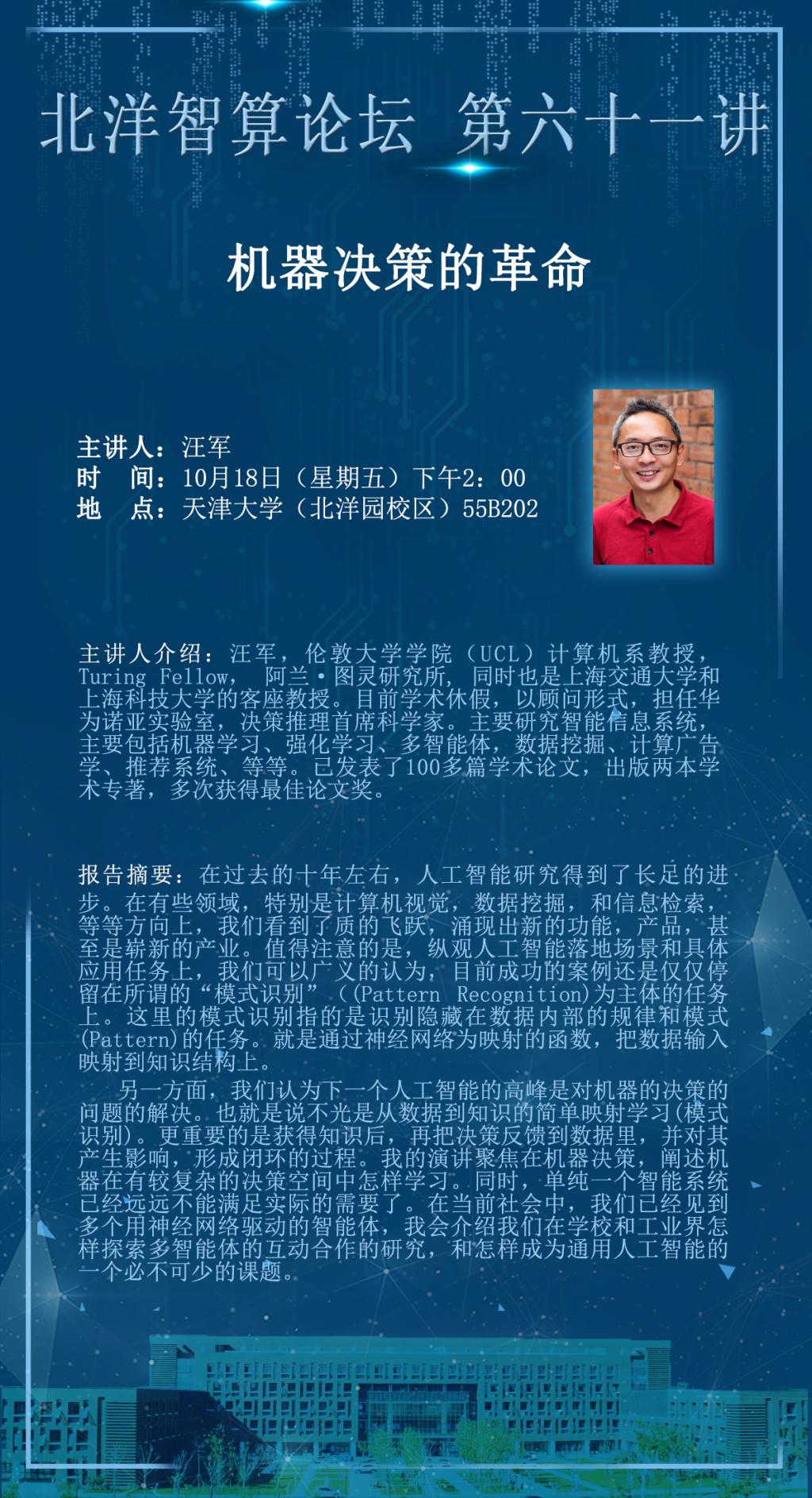 汪军,伦敦大学学院(UCL)计算机系教授,Turing Fellow, 阿兰·图灵研究所, 同时也是上海交通大学和上海科技大学的客座教授。目前学术休假,以顾问形式,担任华为诺亚实验室,决策推理首席科学家。主要研究智能信息系统,主要包括机器学习、强化学习、多智能体,数据挖掘、计算广告学、推荐系统、等等。已发表了100多篇学术论文,出版两本学术专著,多次获得最佳论文奖。