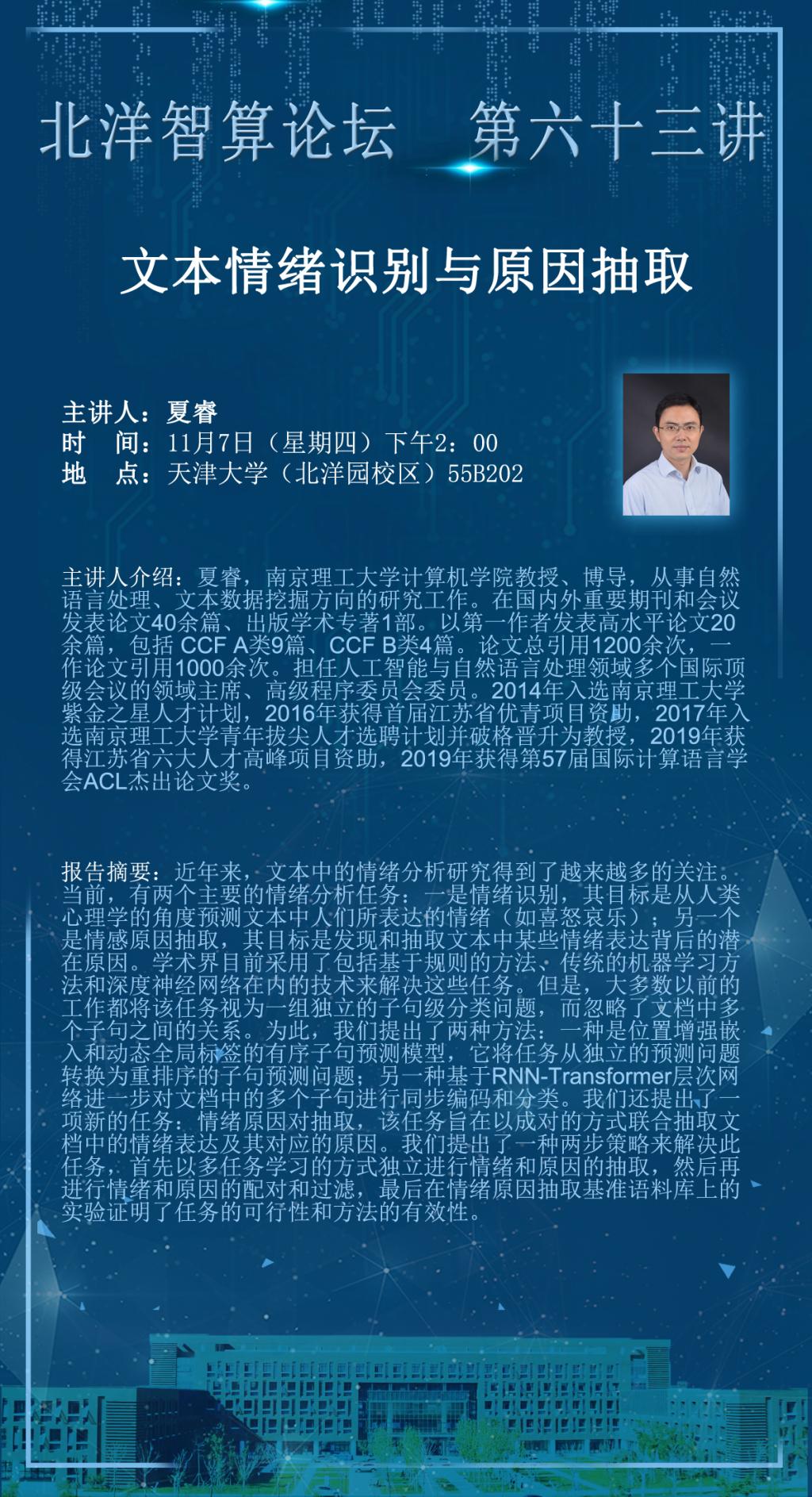 夏睿,南京理工大学计算机学院教授、博导,从事自然语言处理、文本数据挖掘方向的研究工作。在国内外重要期刊和会议发表论文40余篇、出版学术专著1部。以第一作者发表高水平论文20余篇,包括 CCF A类9篇、CCF B类4篇。论文总引用1200余次,一作论文引用1000余次。担任人工智能与自然语言处理领域多个国际顶级会议的领域主席、高级程序委员会委员。2014年入选南京理工大学紫金之星人才计划,2016年获得首届江苏省优青项目资助,2017年入选南京理工大学青年拔尖人才选聘计划并破格晋升为教授,2019年获得江苏省六大人才高峰项目资助,2019年获得第57届国际计算语言学会ACL杰出论文奖。
