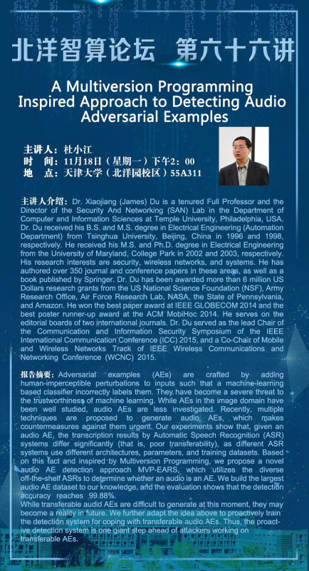 杜小江博士是美国费城天普大学计算机与信息科学系的终身教授和安全与网络(SAN)实验室主任。杜小江博士在北京清华大学获得电气工程(自动化系)学士和硕士学位。他分别于2002年和2003年在马里兰大学帕克学院获得电机工程硕士和博士学位。他的研究兴趣是安全、无线网络和系统。他在这些领域撰写了350多篇期刊和会议论文,以及一本由斯普林格出版的书。杜博士获得了美国国家科学基金会(NSF)、陆军研究办公室、空军研究实验室、美国宇航局、宾夕法尼亚州和亚马逊的600多万美元研究资助。他获得了IEEEGlobeCom 2014年度最佳论文奖和ACMMobihoc2014年度最佳海报亚军奖。他在两种国际期刊的编辑部任职。杜博士曾担任2015年IEEE国际通信会议(ICC)通信和信息安全研讨会的首席主席,以及2015年IEEE无线通信和网络会议(WCNC)移动和无线网络轨道的联合主席。