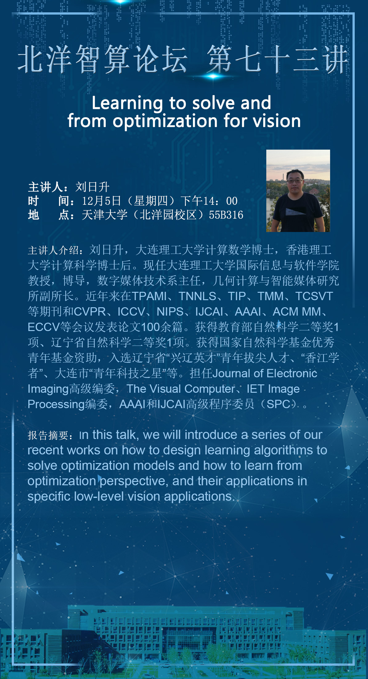在这次演讲中,我们将介绍一系列我们最近的工作,如何设计学习算法来解决优化模型,如何从优化的角度学习,以及它们在具体的底层视觉应用中的应用。