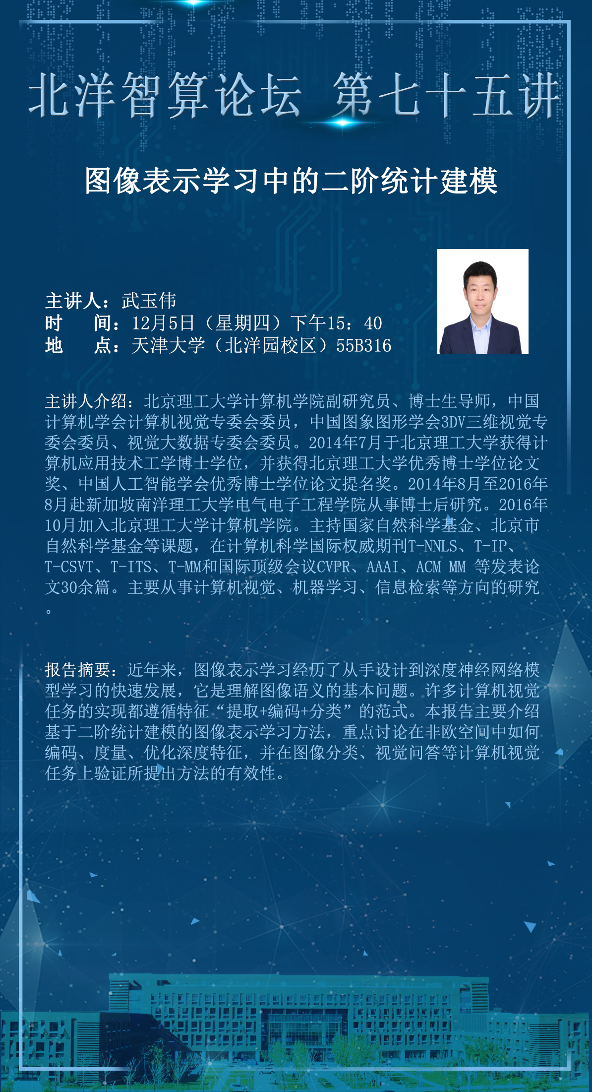 武玉伟,北京理工大学计算机学院副研究员、博士生导师,中国计算机学会计算机视觉专委会委员,中国图象图形学会3DV三维视觉专委会委员、视觉大数据专委会委员。2014年7月于北京理工大学获得计算机应用技术工学博士学位,并获得北京理工大学优秀博士学位论文奖、中国人工智能学会优秀博士学位论文提名奖。2014年8月至2016年8月赴新加坡南洋理工大学电气电子工程学院从事博士后研究。2016年10月加入北京理工大学计算机学院。主持国家自然科学基金、北京市自然科学基金等课题,在计算机科学国际权威期刊T-NNLS、T-IP、T-CSVT、T-ITS、T-MM和国际顶级会议CVPR、AAAI、ACM MM 等发表论文30余篇。主要从事计算机视觉、机器学习、信息检索等方向的研究。