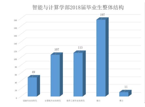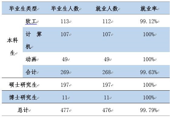 2018届毕业生中,以各种形式直接就业的共有341人。其中21人自由职业(软件工程7人,动画14人)。本科生145人,占本科生总毕业人数的53.9%;硕士研究生187人,占硕士生总毕业生人数的94.9%;博士研究生9人,占博士生总毕业生人数的81.8%。